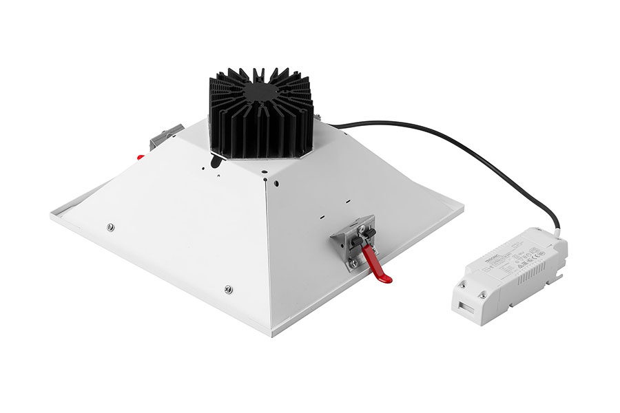 Diese quadratische LED-Einbauleuchte überzeugt durch ihre hohe Lichtausbeute und einen hohen Sehkomfort durch ihre spezielle Optik mit prismatischem Diffusor und mattem Reflektor. Ebenso wie das Schwestermodell PRETTUS bietet die NOVIEL ein temperaturgeschütztes Netzteil, eine sehr hohe Farbkonsistenz, sowie DALI oder ein integriertes Notlicht. Die Noviel II gibt es in 3 verschiedenen Einbaugrößen von S bis L und 6 verschiedenen Leistungsklassen.
